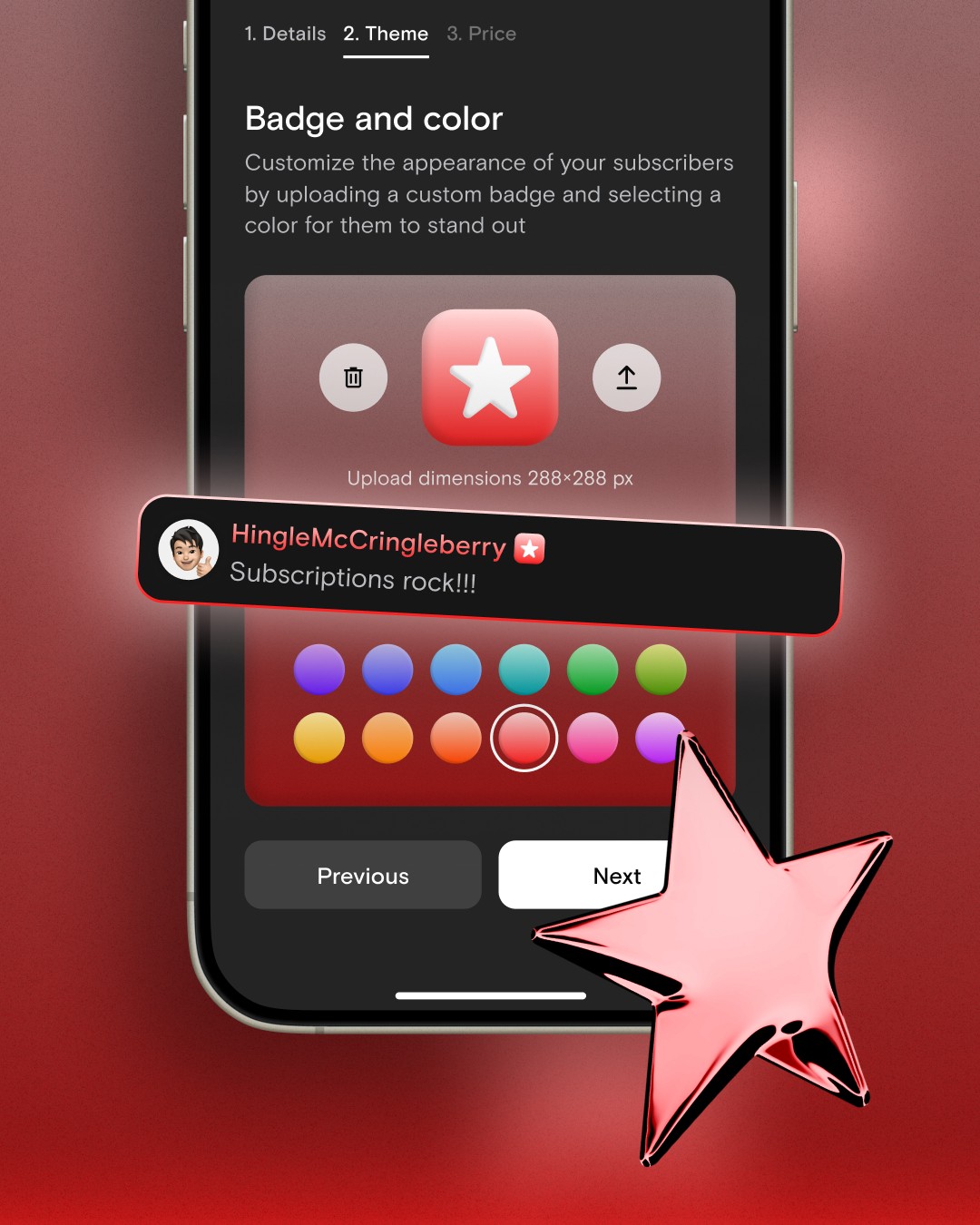 Creators can customize the subscription name, color and badge to giver their subscribers a community-branded look. Room visitors can see how long someone has been a subscriber and creators can keep track of their most loyal supporters.