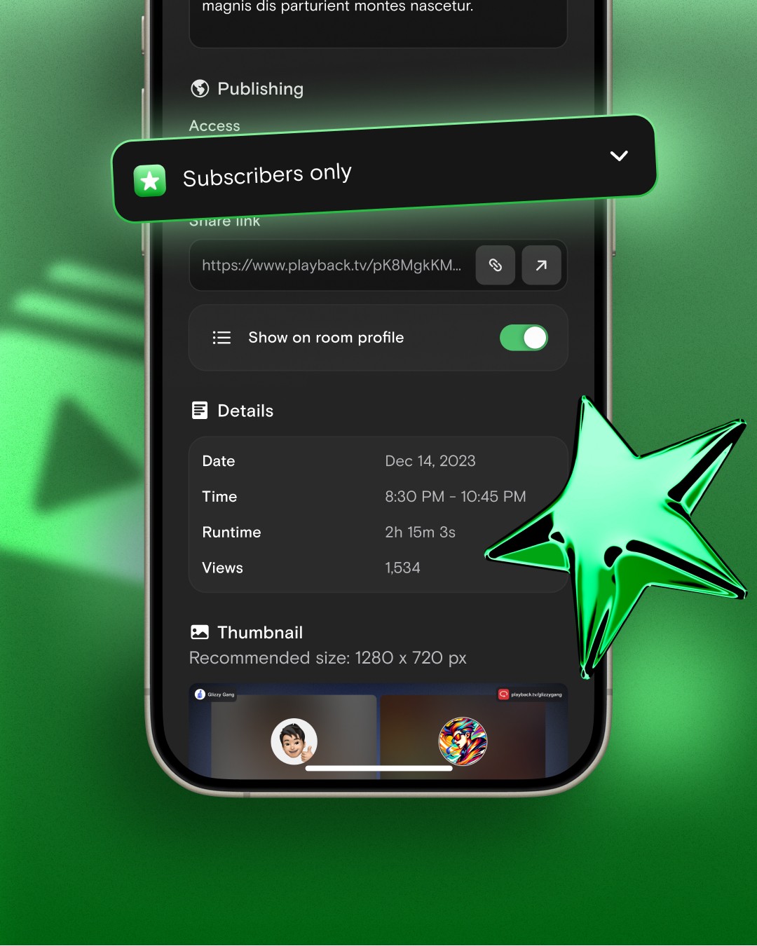 We hope Room Subscriptions will be a foundational piece of infrastructure for you on Playback. Over time, we will continue to make rooms more interactive and further allow you to customize what your premium subscribers are able to do in your room. We also plan to improve commerce capabilities like support for multiple tiers, discounts, annual subscriptions, gifting and more.